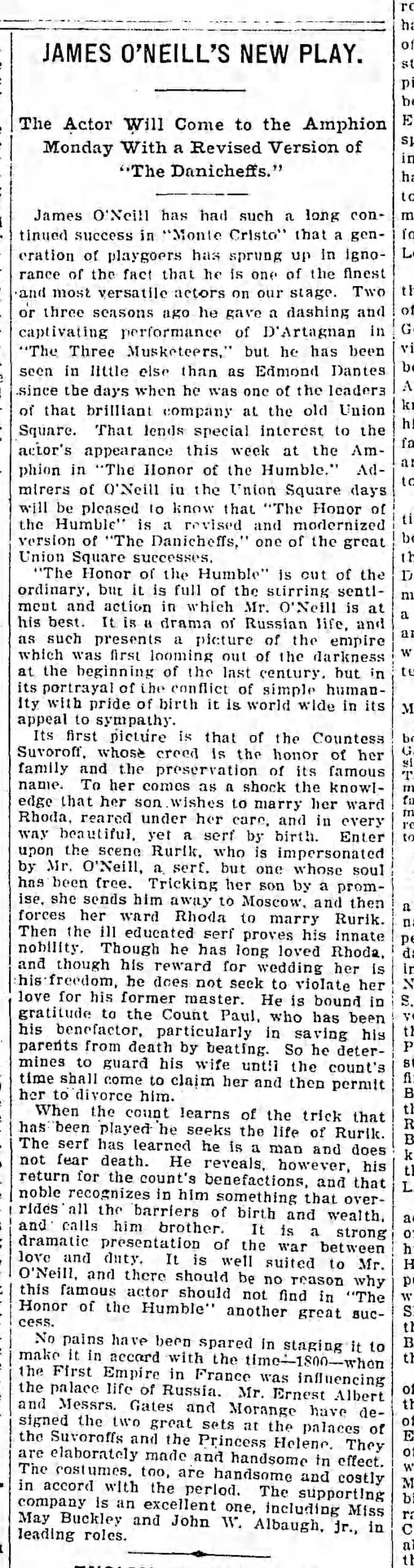 James O’Neill’s brother-in-law offered him a job in his business selling military uniforms during the Civil War. He also paid for a tutor for James, who introduced the young man to the theater. Later, O’Neill tried to establish several small businesses, all of which failed. When he was 21, he took a small role in a production in Cincinnati. “I began the thing as a lark,” O’Neill recalled, “but the stage manager prevailed on me to remain.” While still in his 20s, O’Neill earned a compliment from the greatest American actor of the day, Edwin Booth, who saluted O’Neill for the way he mastered his Shakespearean roles. [source]