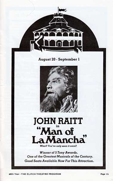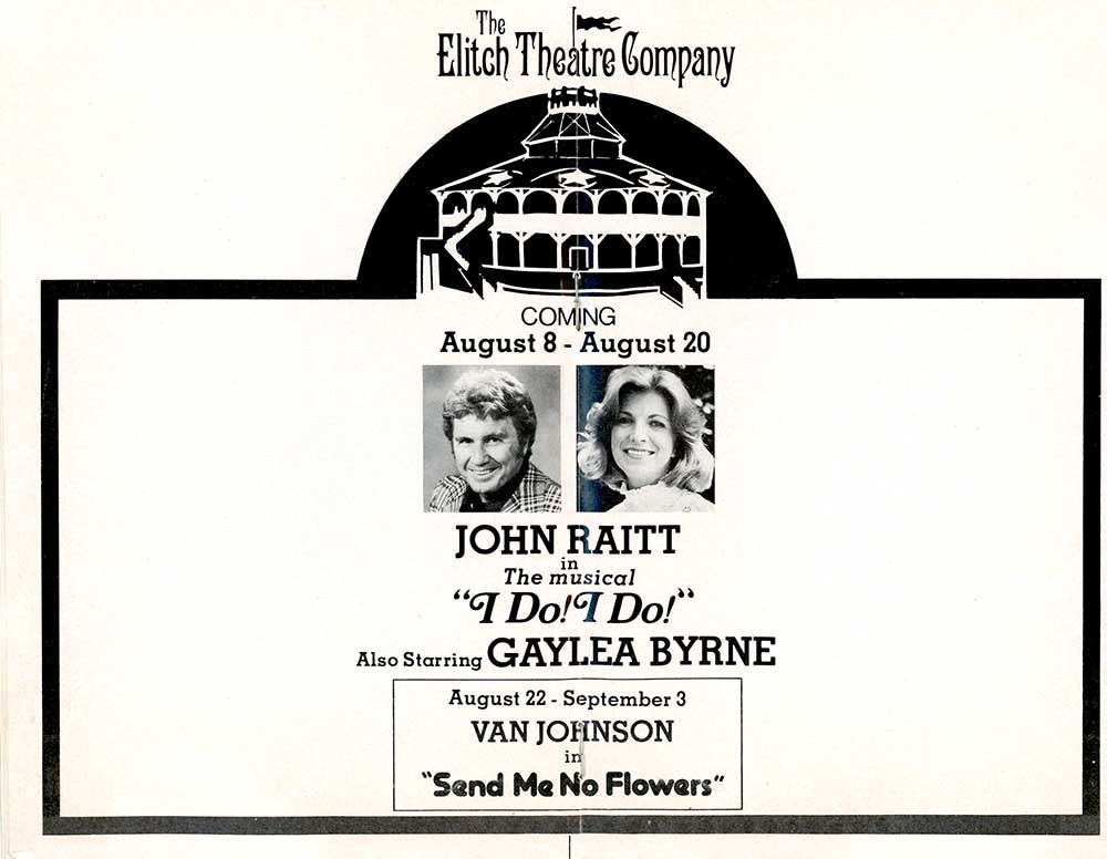 John Raitt may be best known for his Broadway musical roles, including Carousel and Oklahoma! or he may actually be best known as Bonnie Raitt’s father. Raitt appeared at the Historic Elitch Theatre three times: 1976’s Shenandoah, 1977’s I Do! I Do!, and 1979’s Man of La Mancha.