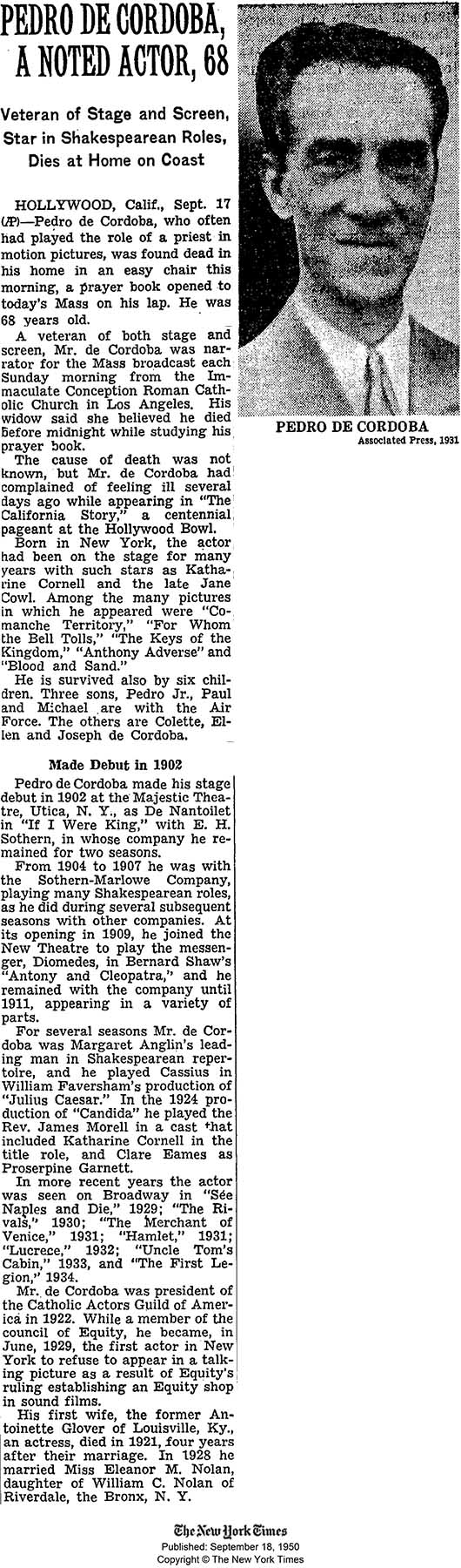 In 1913, Pedro was a member of the resident summer stock cast at Elitch Theatre. His first film was Cecil B. DeMille’s version of Carmen (1915), and he soon became a regular leading man in Hollywood. His Broadway career cast him with such stage actresses as Jane Cowl and Katharine Cornell.